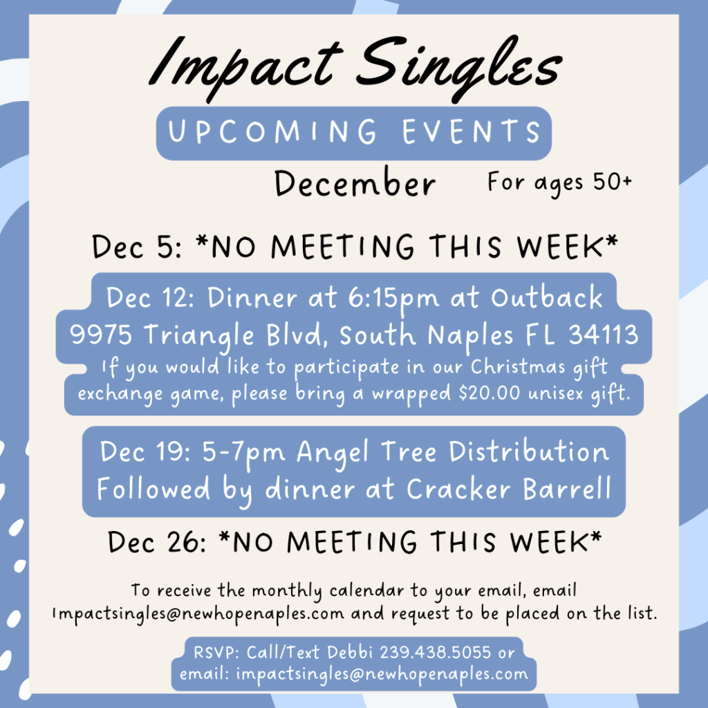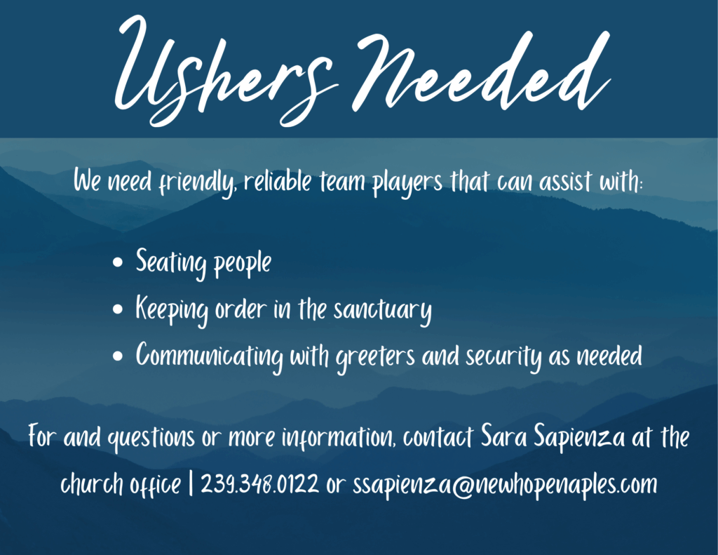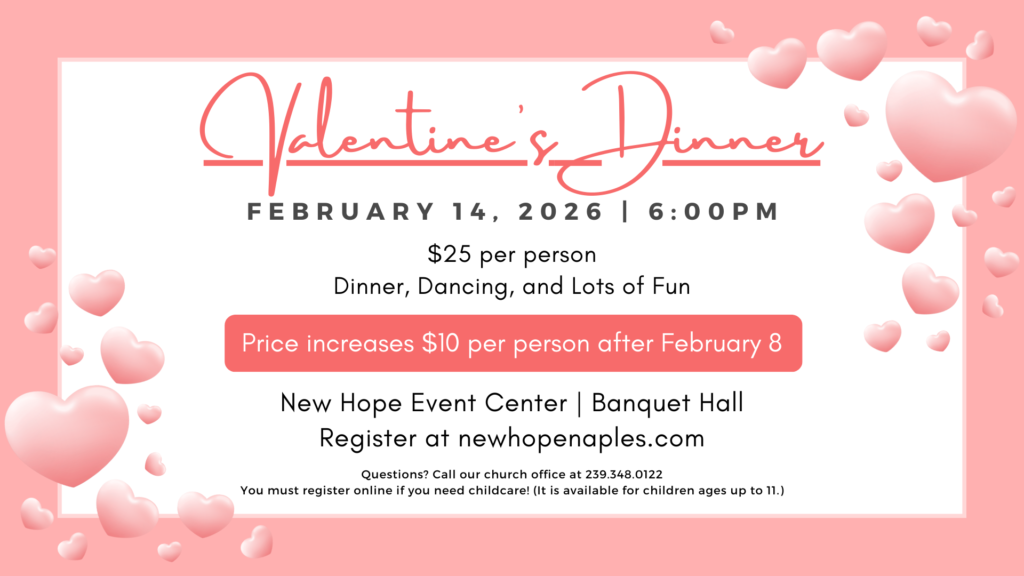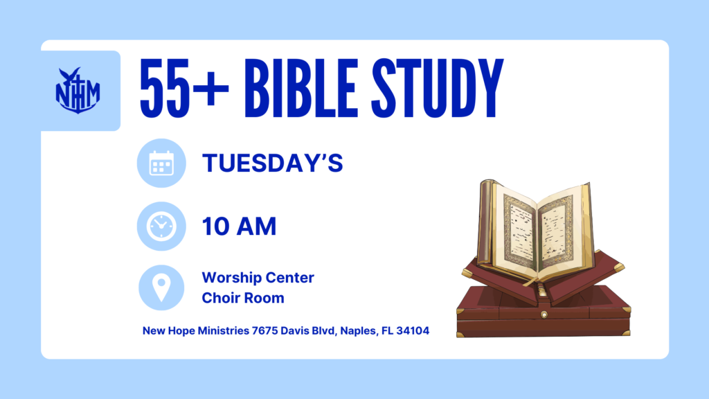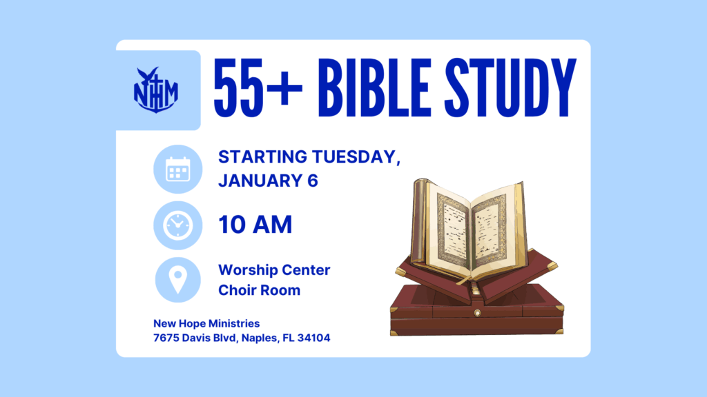 Welcome to New Hope Ministries, a Christ-centered community in Naples, Florida, where we are passionate about Equipping People to Serve God, Family, Church, Community, and the World. Since our beginnings as a home Bible study in 1982, we have grown into a vibrant church family committed to sharing God’s love, building relationships, and inspiring lives to fulfill His purpose.