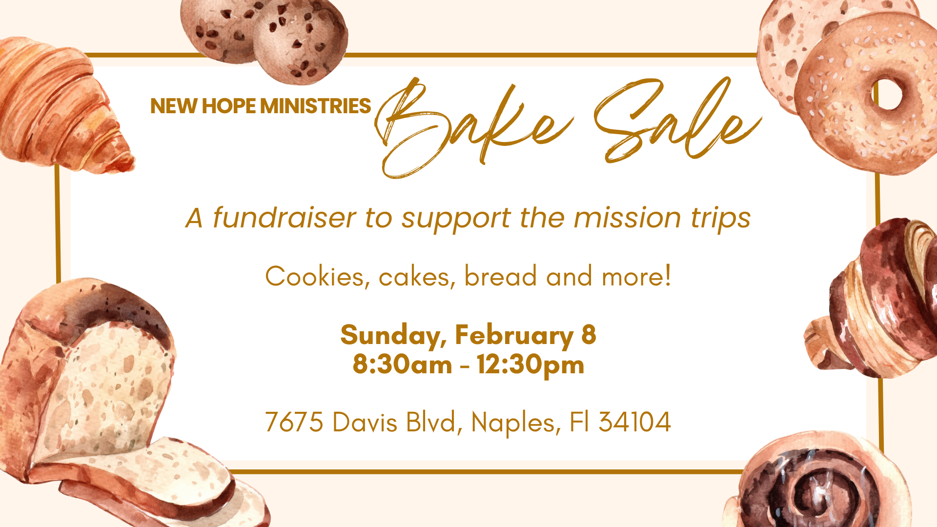 « All Events This event has passed. Event Navigation « Not the Boomers H2H Women’s Bible Study » Bake Sale Details Date: February 8 Time: 8:30 AM - 12:30 PM Share on: Add to calendar Google Calendar iCalendar Outlook 365 Outlook Live