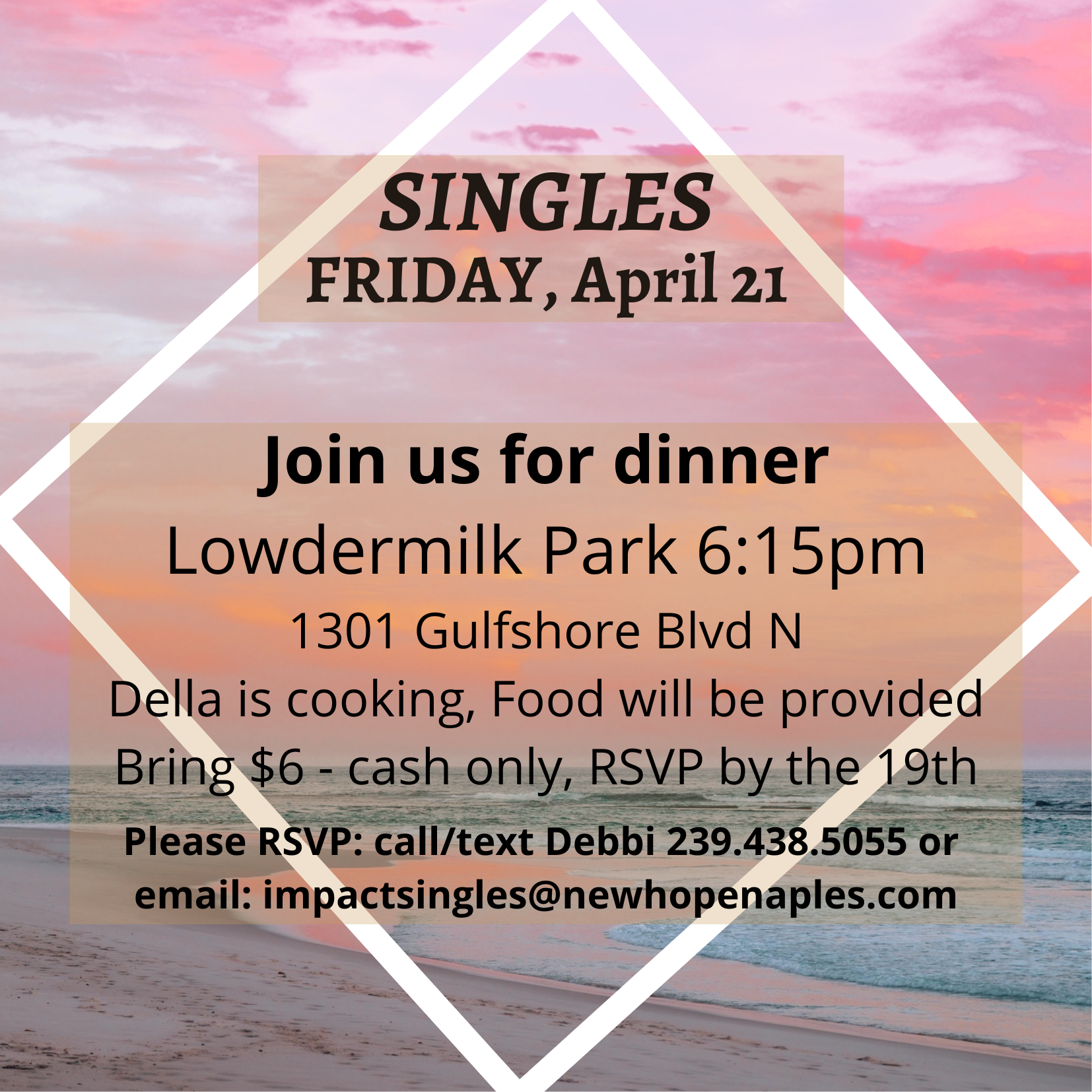 « All Events This event has passed. Event Navigation « Wednesday Night Dinner Sunday Worship Service 9am » Impact Singles Details Date: 04/21/2023 Time: 6:15 PM - 8:00 PM Share on: Add to calendar Google Calendar iCalendar Outlook 365 Outlook Live