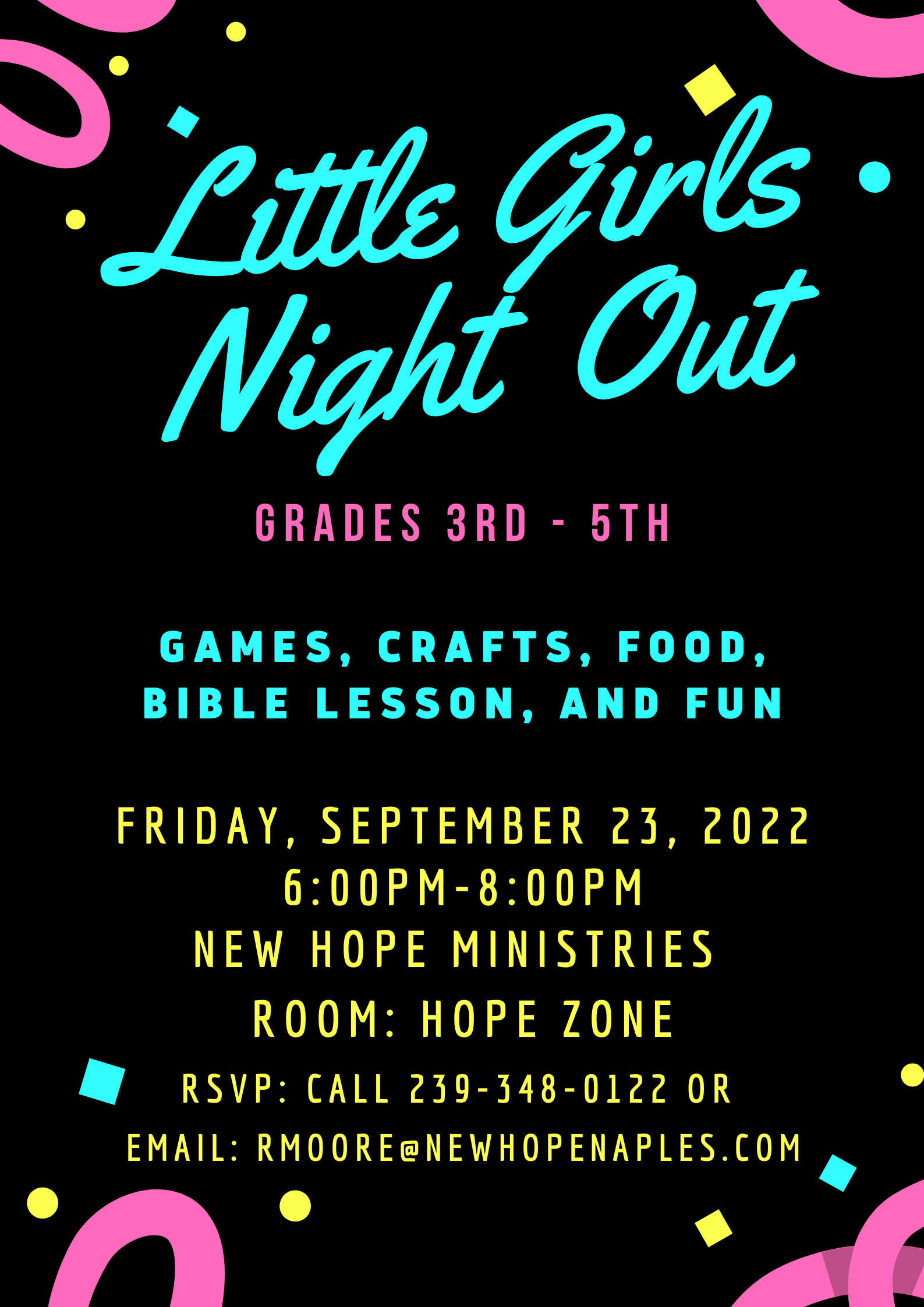 « All Events This event has passed. Event Navigation « Sisterhood Social Water Baptism » Little Girls Night Out Details Date: 09/23/2022 Time: 6:00 PM - 8:00 PM Share on: Add to calendar Google Calendar iCalendar Outlook 365 Outlook Live