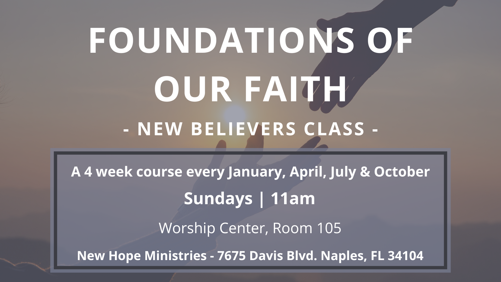 « All Events This event has passed. Event Navigation « Impact Singles 50+ Vacation Bible School 2025 » New Believers Class Details Date: 07/06/2025 Time: 11:00 AM Share on: Add to calendar Google Calendar iCalendar Outlook 365 Outlook Live