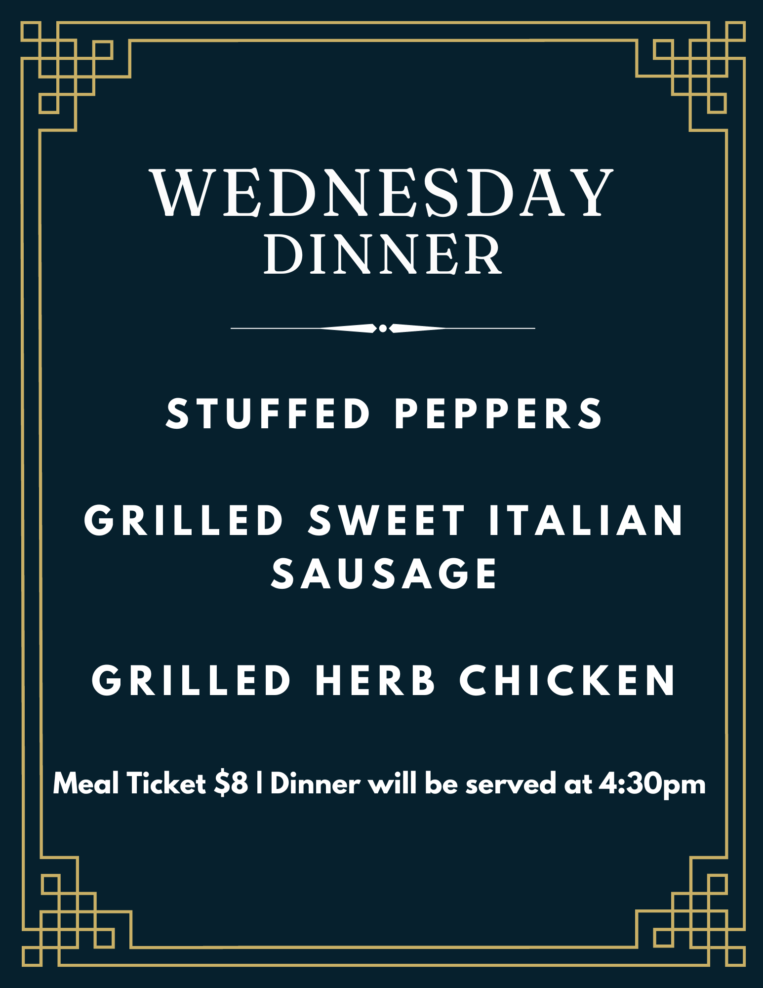 « All Events This event has passed. Event Navigation « Water Baptism Impact Singles » Wednesday Night Dinner Details Date: 06/14/2023 Time: 4:30 PM - 6:15 PM Share on: Add to calendar Google Calendar iCalendar Outlook 365 Outlook Live